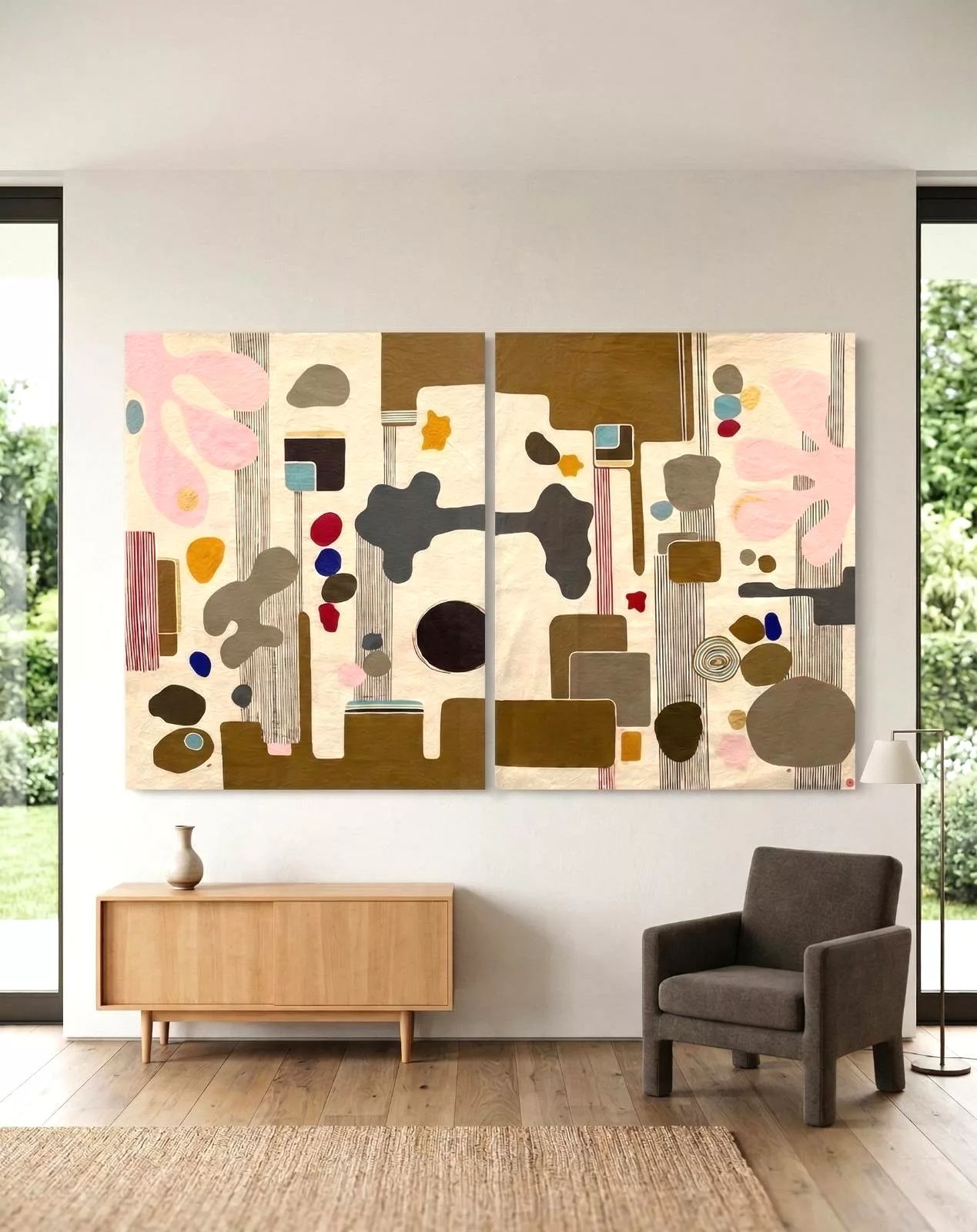 Her style, at the crossroads of lyrical abstraction, art brut and expressionism, is inspired by Miro, Le Corbusier, the design and colors of the 60s and 70s, Africa, the gaiety of Batik prints, textile fashion, the retro of a Hermès red…