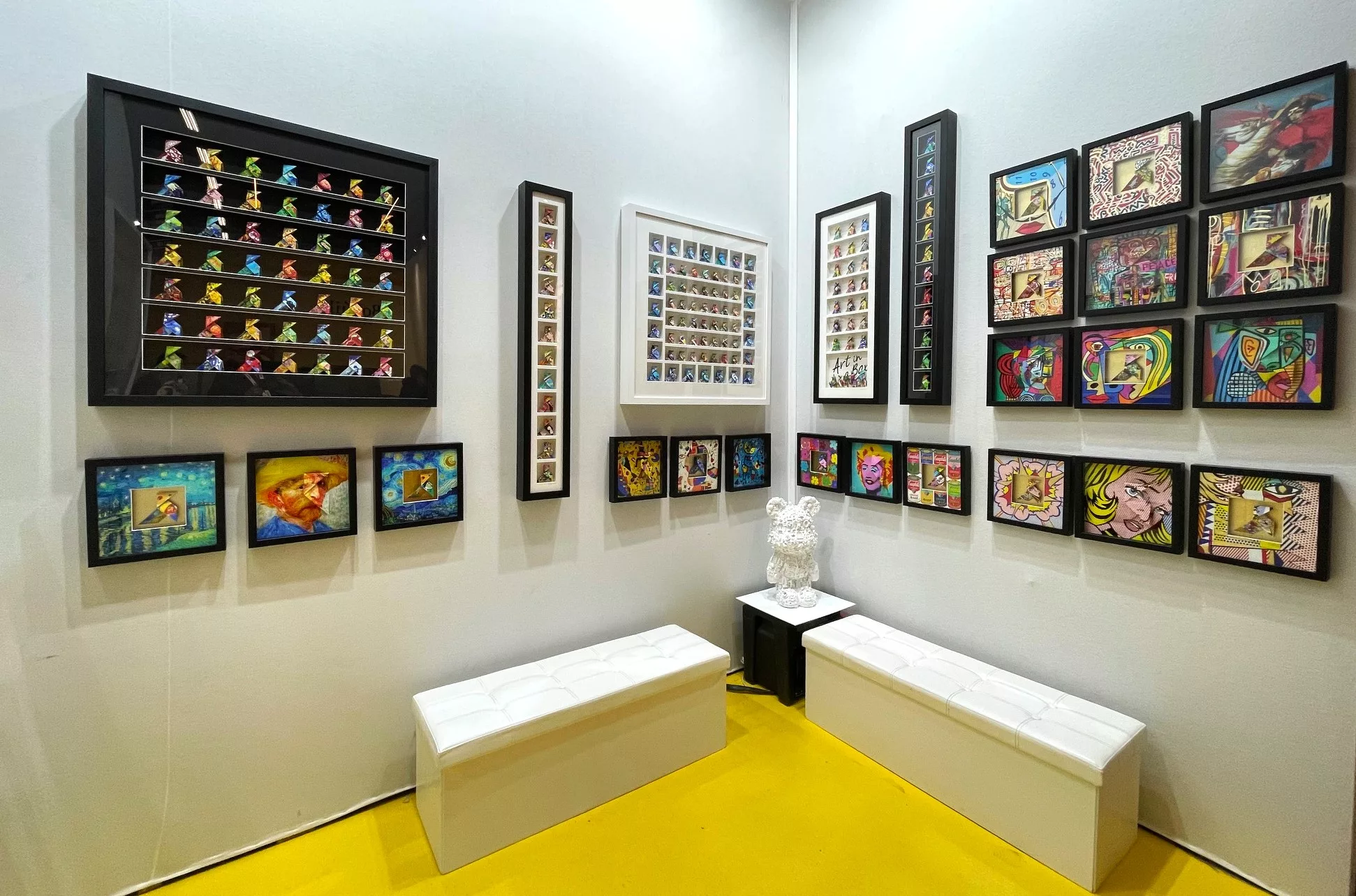 His works are paintings that mix images from all horizons, whether they are paintings, tapestries, architectural elements or photographs that have no apparent logical relationship, but which fit into the reconstruction of a unique universe. These unsuspected associations, full of fantasy, transport us in a surreal world with an accessible visual vocabulary. Hypnotic, the composition of each box takes the observer on a journey to the heart of the artist’s imagination.