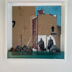 La démarche de cette série est de recontextualiser des œuvres du street art à la lecture de notre réalité climatique. Chaque pièce est un « paysage urbain », photo d’un moment, d’un espace de rue qui nous appelle à la réflexion face à la montée des eaux. IL ne s’agit pas de « copier » une œuvre existante. L’idée est de s’appuyer sur cette œuvre urbaine signifiante pour permettre le dialogue avec les personnages miniatures posés en écho. Deux mondes se rencontrent, échangent en espérant se sauver lui même.
